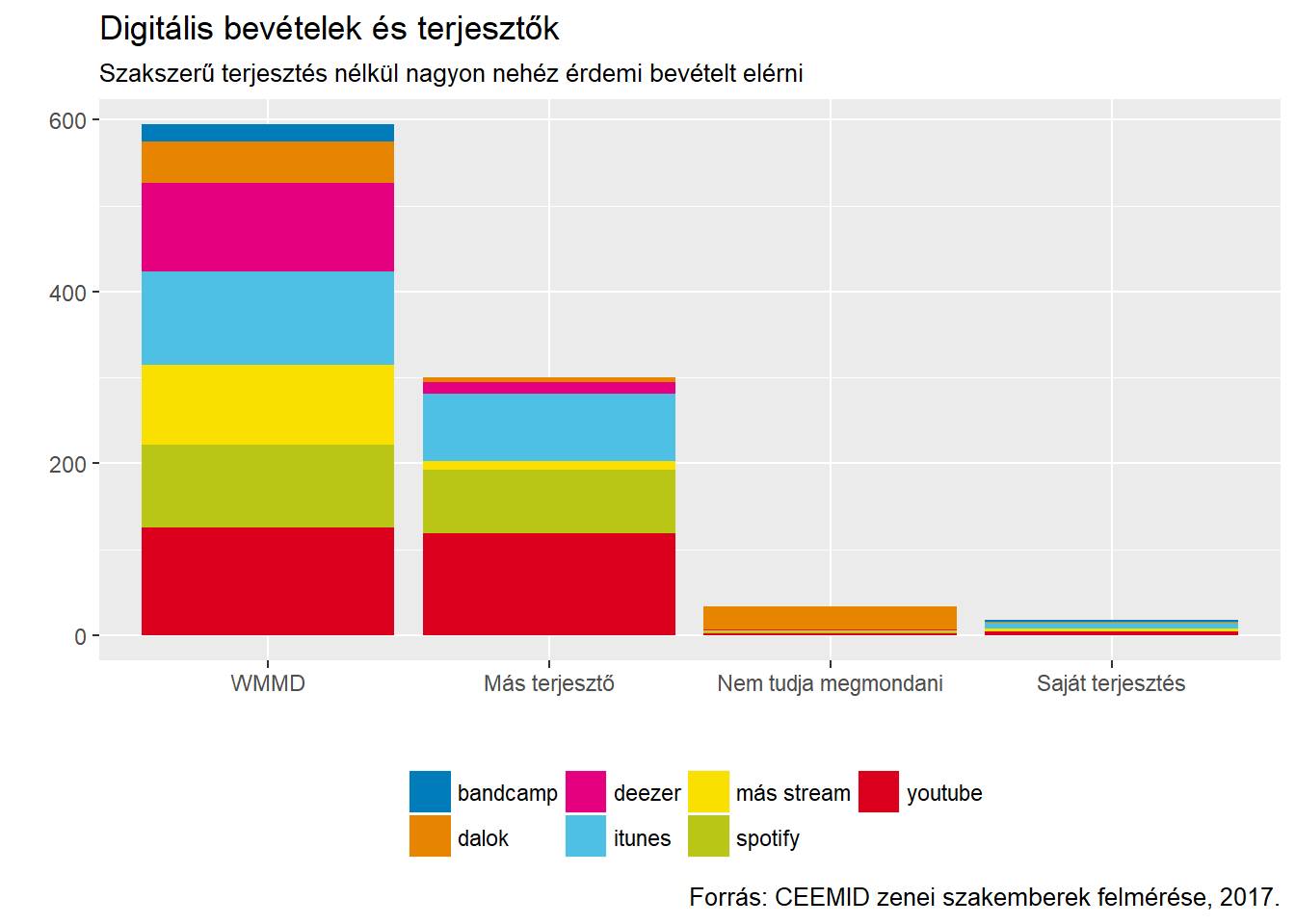 Tapasztalataink szerint csak azok tudnak érdemi bevételt elérni ezekből a csatornákból, akik magyar vagy nemzetközi professzionális terjesztővel rendelkeznek. A hazai piacvezető WMMD mellett az összes többi terjesztőt összevonva mutatjuk be (a WMMD-nek majdnem akkora a piaci részesedése a mintánkban, mint a többi terjesztőnek együttesen.)