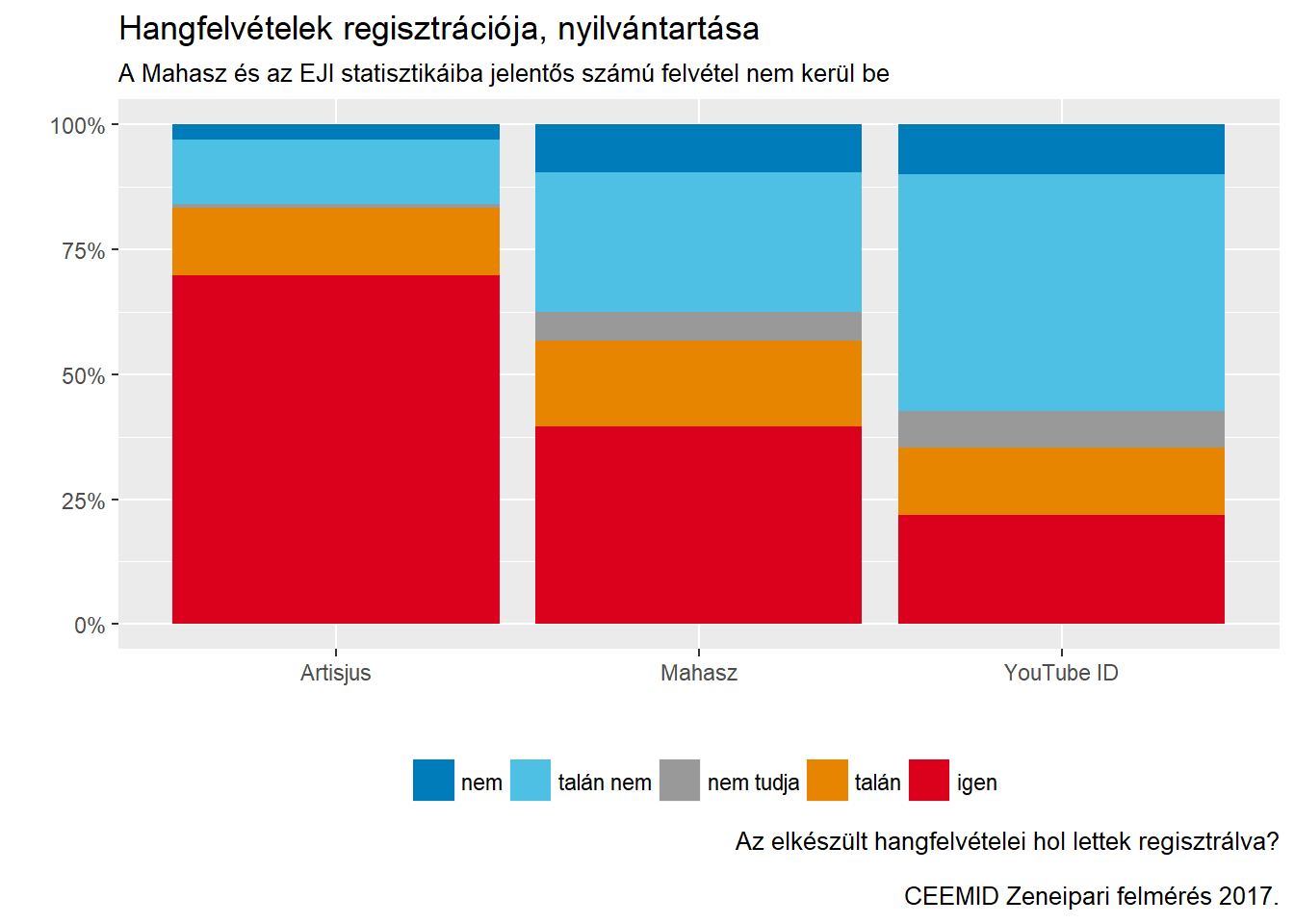 Miért kérdezzük? A hazai zenei piac felmérése, és különösen az üreshordozó kompenzáció kiszámítása, és annak a felosztása is akkor igazságos, ha nem csak azok a művészek kerülnek be a rendszerbe, akik például tagjainak a Mahasznak. Amint látható, igen jelentős számú olyan független alkotó van, aki az Artisjus felé lejelenti az új felvételeit, de a Mahasz/EJI rendszerébe nem, és a YouTube-tól se szerez content ID-t.